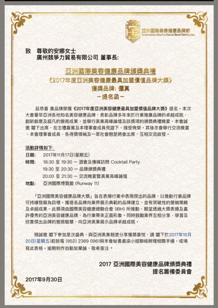 早于九月底儷真品牌就收到了IBH美容健康總聯(lián)合會邀請函,鑒于儷真品牌在頭皮健康管理、防脫止脫生發(fā)方面在專業(yè)上做出的貢獻,提名幾項大獎。